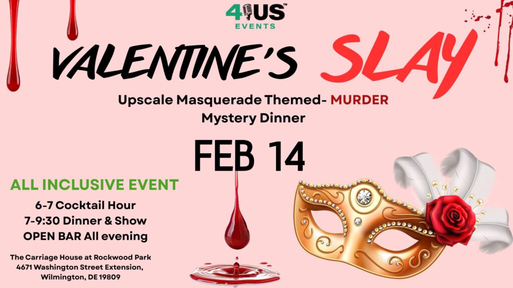 This Valentines day forget the same boring ideas! Join us for this ALL INCLUSIVE night of Food, Cocktails and of course MURDER! Valentine’s Slay An Upscale Masquerade-Themed Murder Mystery Dinner…